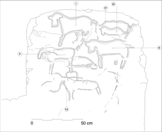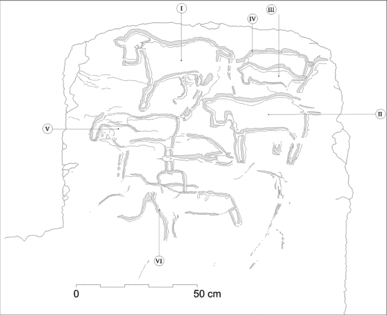 El conjunto lo forman de tres caballos y  otro animal no definido, además de algunos signos geométricos. Estos animales se perfilan con un incipiente bajorrelieve sobre una losa de 1,95 m de altura y 2,25 m de ancho en su base. Se detecta como por momentos la erosión ha cicatrizado su huellas en algunas de las representaciones, que en conjunto con la presencia de líquenes dificultan la identificación correcta de los grabados, hecho que se acentúa especialmente en los grabados con técnicas de incisión fina. Los arqueólogos proponen tres períodos diferentes de trabajo dentro del panel, con los grabados profundos elaborados durante la primera fase, seguidos por una secuencia de reelaboraciones.